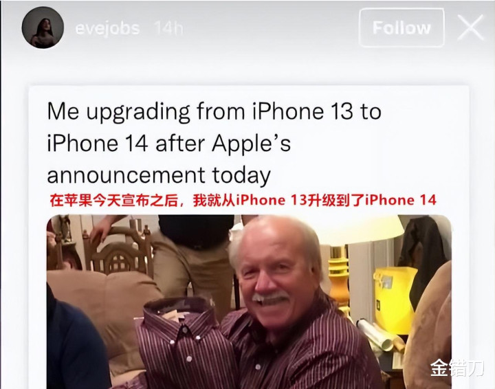 当时发布会后,连乔布斯的女儿都吐槽iPhone 14毫无新意,用两件相同的条纹衬衫暗讽苹果。